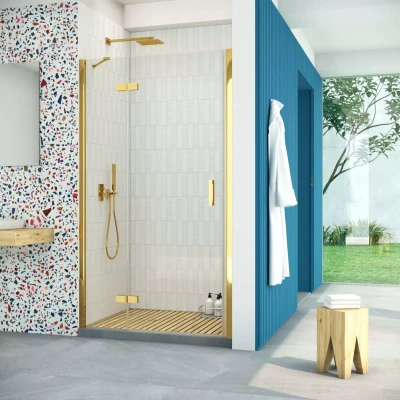 Жена хотела именно золотой профиль под смесители. Vegas Glass не подвели, петли работают плавно, вода наружу не просачивается, герметичность на высоте.