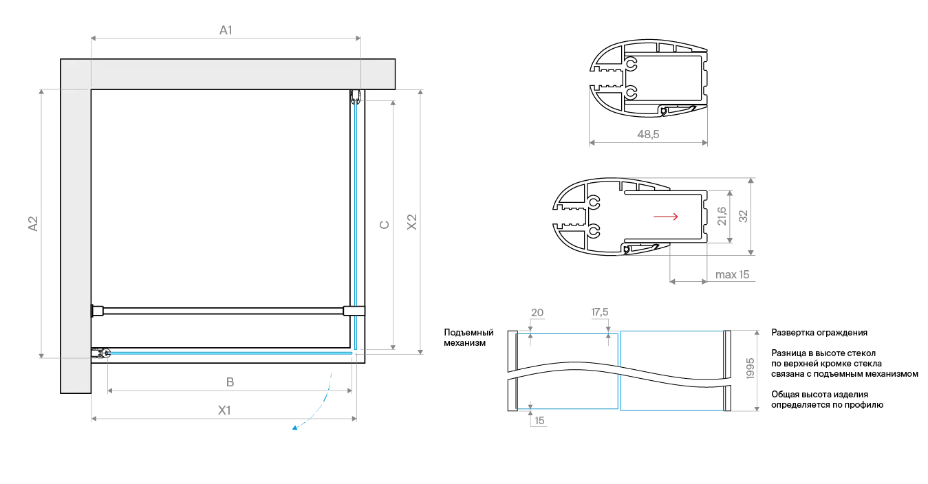 • Особенности модели: Защитное покрытие, Варианты стекол, Цвета профилей, Доступен нестандарт, Гарантия 2 года, Закалённое стекло 6 мм, Можно монтировать на пол, Высота
