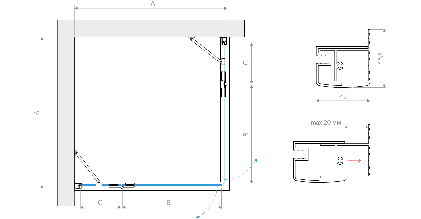 • Особенности модели: Защитное покрытие, Варианты стекол, Цвета профилей, Доступен нестандарт, Гарантия 2 года, Закалённое стекло 6 мм, Можно монтировать на пол, Высота, Петли с функцией подъёма