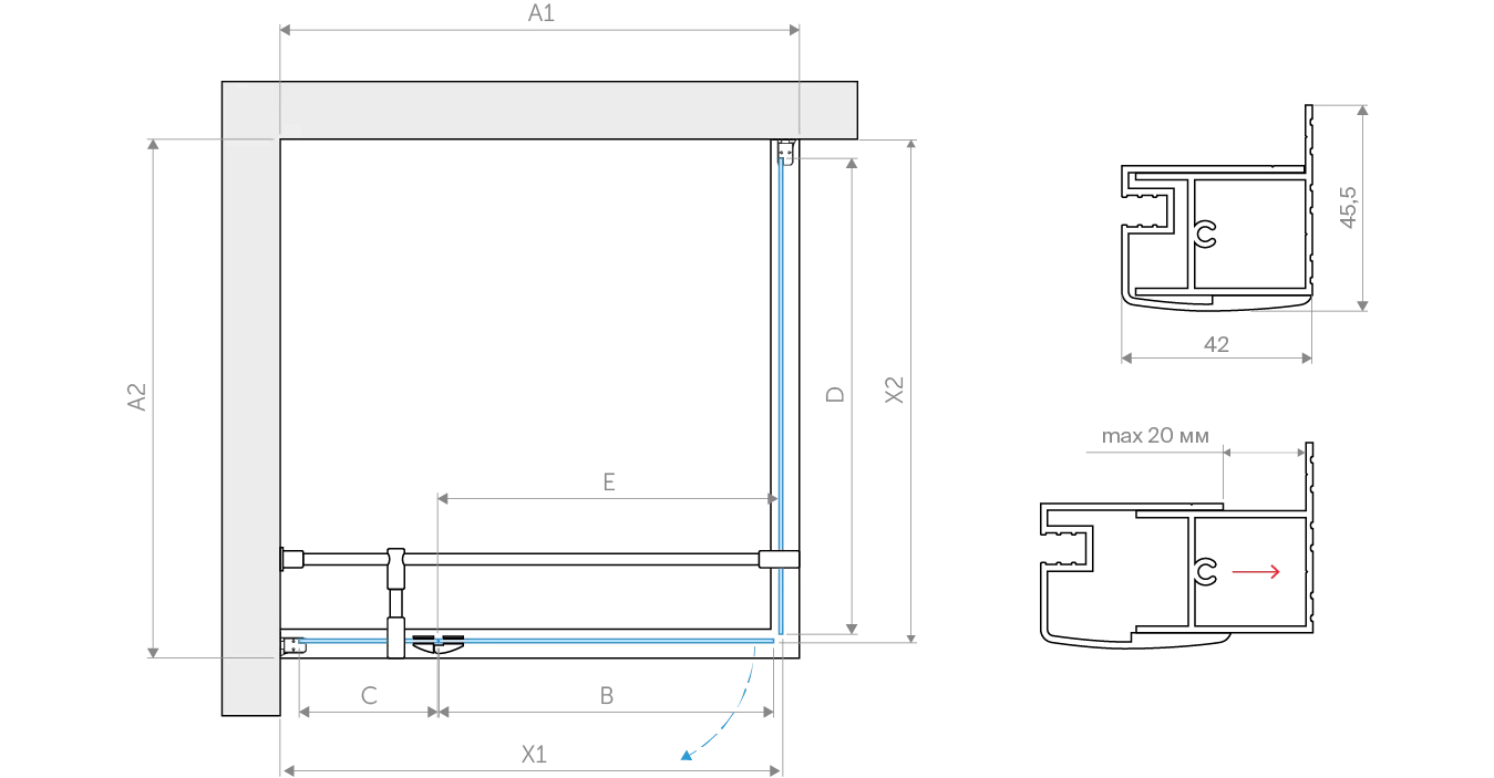 • Особенности модели: Защитное покрытие, Варианты стекол, Цвета профилей, Доступен нестандарт, Гарантия 2 года, Закалённое стекло 6 мм, Можно монтировать на пол, Высота, Петли с функцией подъёма