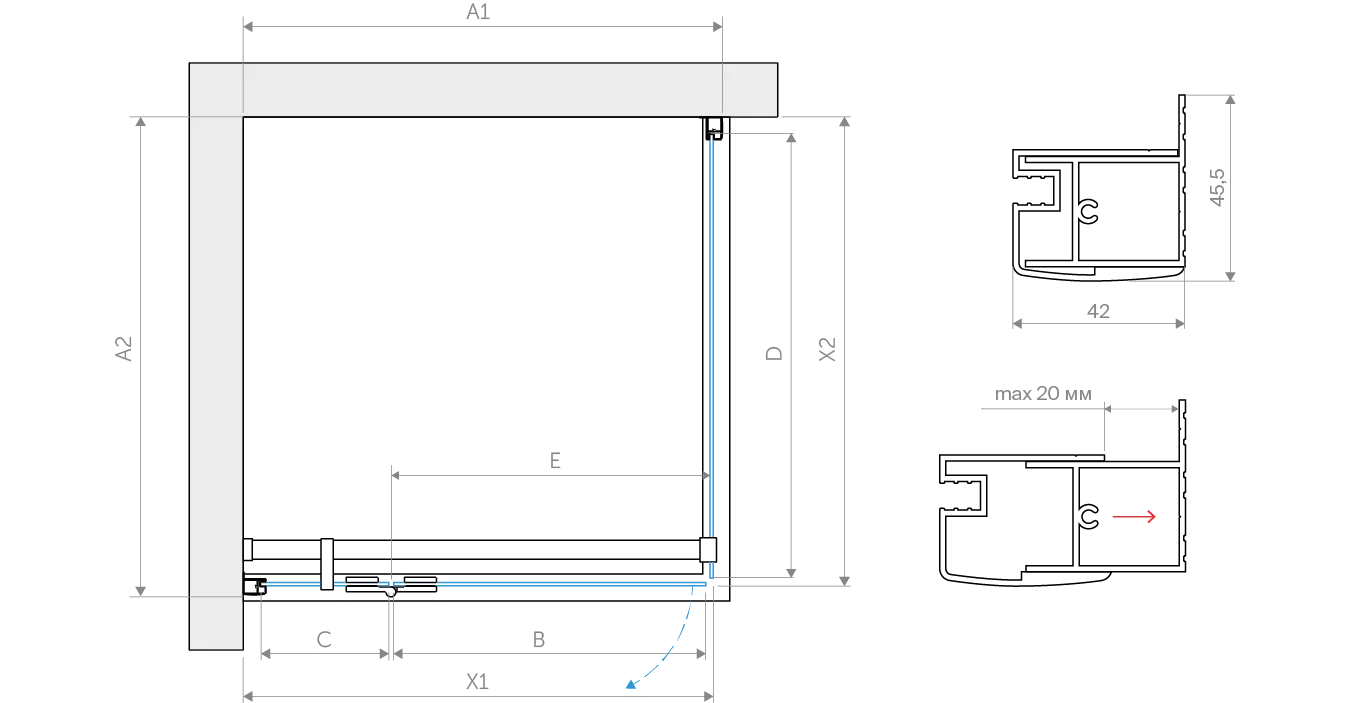 • Особенности модели: Защитное покрытие, Варианты стекол, Цвета профилей, Доступен нестандарт, Гарантия 2 года, Закалённое стекло 6 мм, Можно монтировать на пол, Высота, Петли с функцией подъёма